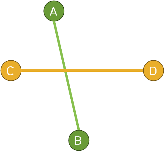 다음과 같은 경우에는 A,B와 C,D의 상대적 위치를 비교해 줘야한다. A,B둘중에 좌표가 큰값과 C,D중에 좌표가 큰값을 서로의 작은 값보다 클 때만 선분이 교차한다.