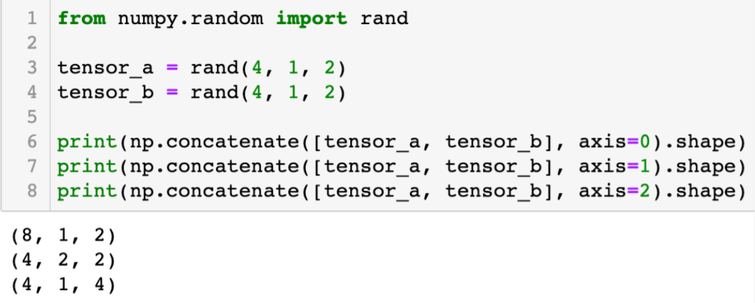 두 텐서를 이어 붙여서 새로운 텐서. axis 값에 따라 shape의 크기가 늘어나는 곳을 알 수 있다.