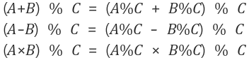 하지만 기본적으로 모듈러 연산에 대한 분배법칙은 곱셈,덧셈,뺄셈에 대해서만 성립되고 나눗셈에 대해서는 성립되지 않는다.
