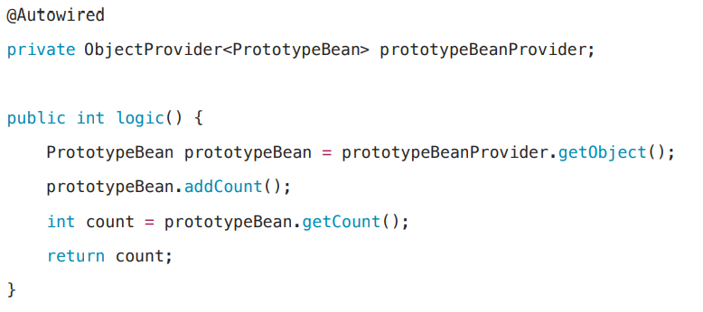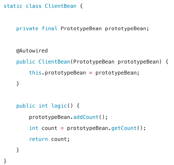 이런 방식이면 클라이언트들이 싱글톤인 clientBean을 사용할 때 마다 다른 객체가 생성되길 바라는 프로토타입의 효과를 보지 못한다.(이미 주입이 완료된 상태인 싱글톤 빈을 공유해서 사용하기 때문에)