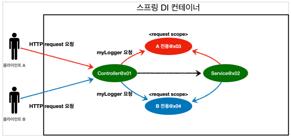 request: HTTP 요청 하나가 들어오고 나갈 때 까지 유지되는 스코프, 각각의 HTTP 요청마다 별도의 빈 인스턴스가 생성되고, 관리