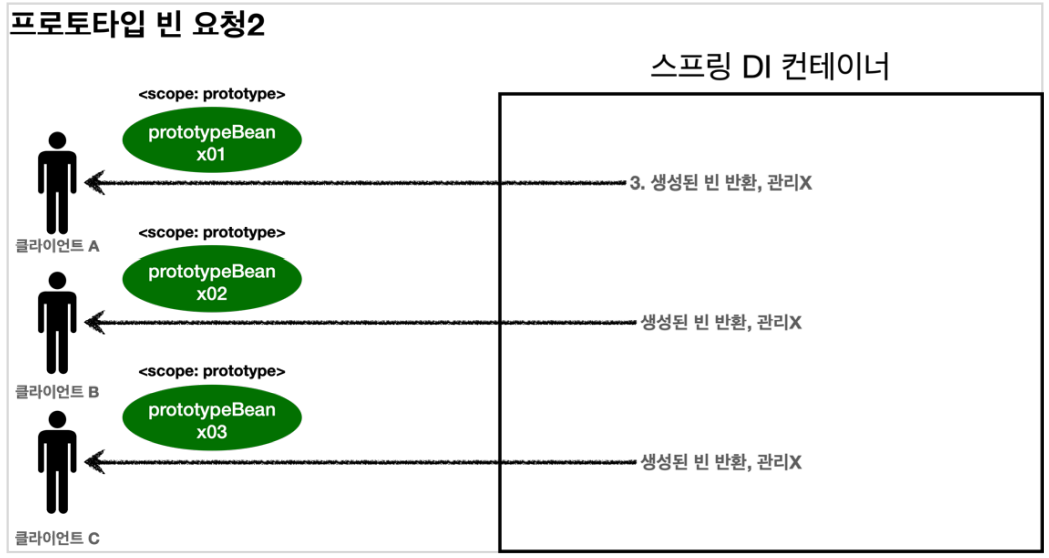 더는 관리하지 않는 매우 짧은 범위의 스코프. @Scope("prototype")로 선언한다.