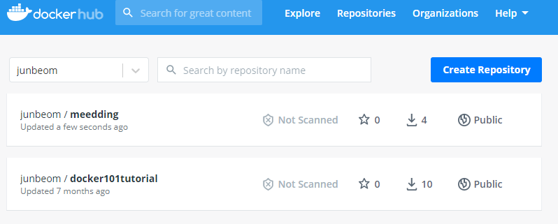 그 후 이미지 명명규칙에 따라 이미지 이름을 변경하고 DockerHub에 푸시했다.