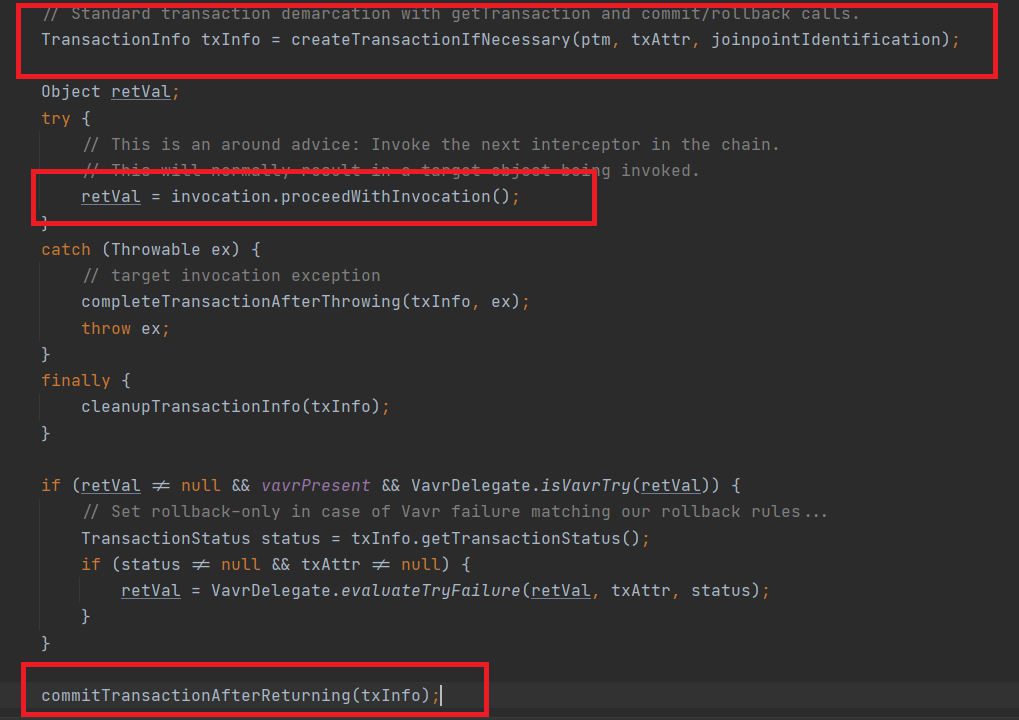 이러한 프록시 패턴 방식으로 구현되어 우리는 항상 proceedWithInvocation() 부분만 신경을 써서 나머지 트랜잭션 처리에 대한 코드를 신경쓰지 않고 트랜잭션을 사용할 수 있던 것이다.