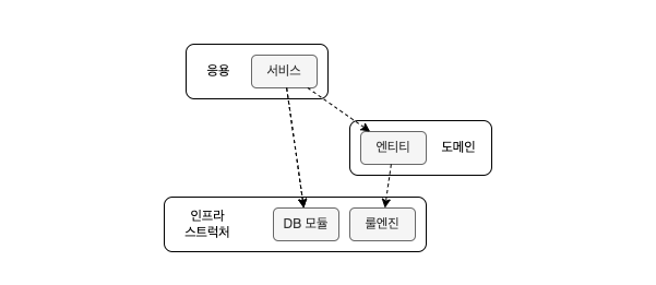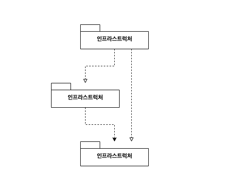 예를 들어 응용 계층은 바로 아래 도메인 계층에 의존하지만 외부시스템과의 연동을 위해 인프라 계층에 의존하기도 한다.