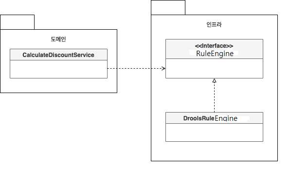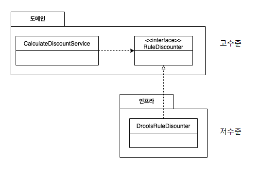 CalculateDiscountService RuleDiscounter는 "룰을 이용한 할인 금액 계산"을 추상화한 고수준 모듈 RuleDiscounter에 의존하게 되고, DroolsRuleDiscounter는 RuleDiscounter를 구현한 것으로 저수준 모듈이 고수준 모듈에 의존한 것이 된다.