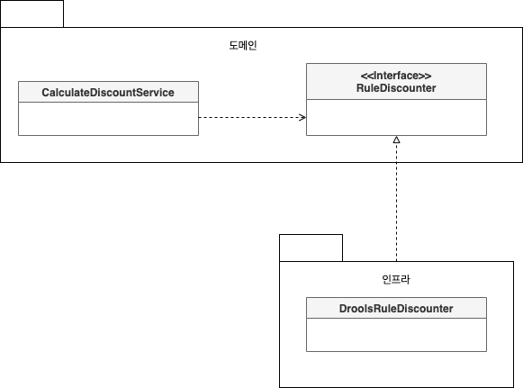 CalculateDiscountService는 할인룰적용을 Drools를 통해 구현했는지, 다른 모듈로 구현했는지 관심이 없고 그저 applyRules 메서드만 수행할 수 있으면 된다. 따라서 RuleDiscounter 인터페이스를 만들어 룰 적용을 구현할 클래스들이 상속받게 만들면 CalculateDiscountService는 더 이상 룰 관련 코드를 이해할 필요가 없다.